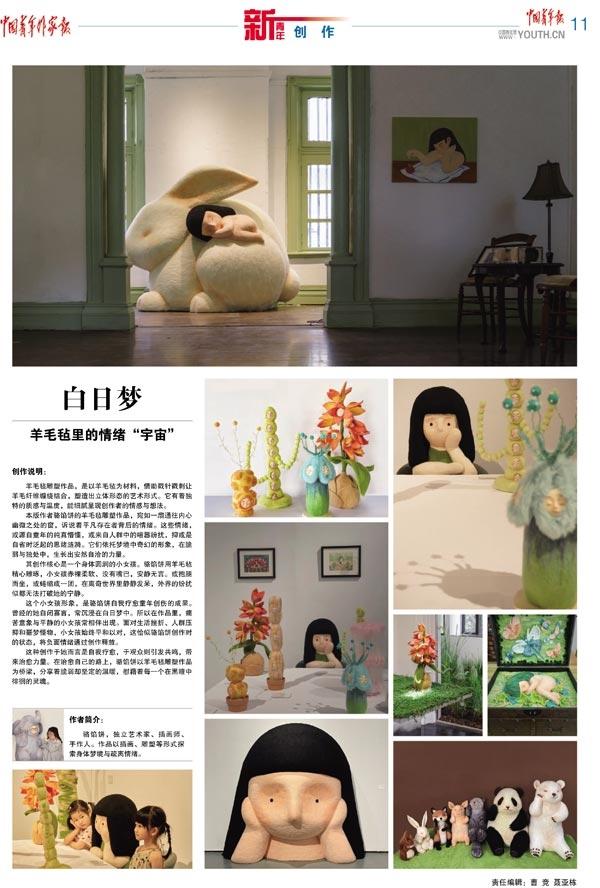 本版作者骆馅饼的羊毛毡雕塑作品,宛如一扇通往内心幽微之处的窗,诉说着平凡存在者背后的情绪。这些情绪,或源自童年的纯真懵懂,或来自人群中的喧嚣纷扰,抑或是自省时泛起的思绪涟漪。它们依托梦境中奇幻的形象,在脆弱与独处中,生长出安然自洽的力量。