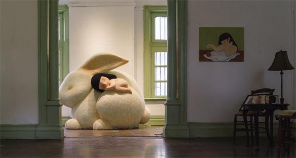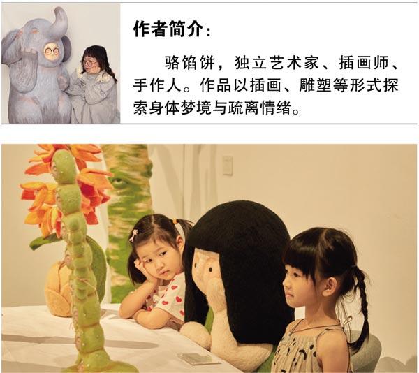 其创作核心是一个身体圆润的小女孩。骆馅饼用羊毛毡精心雕琢,小女孩赤裸柔软、没有嘴巴,安静无言。或抱腿而坐,或蜷缩成一团,在离奇世界里静静发呆,外界的纷扰似都无法打破她的宁静。