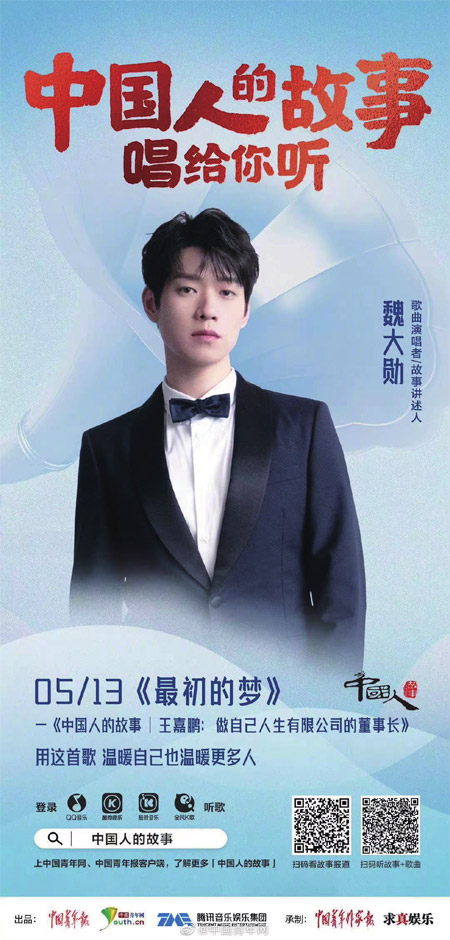 讲述中国人的故事,汇聚向上向善的力量,由中国青年报·中国青年网、腾讯音乐娱乐集团出品,《中国青年作家报》、求真娱乐联合承制的“中国人的故事·唱给你听”音乐项目,已正式上线开播。每期节目将推出一首歌曲,邀请一位青年唱作人,讲述一段中国人的故事,将故事融入音乐,将楷模的力量传递给每一个人。本期,让我们听魏大勋讲述世界联合学院国际理事会理事、中国常熟世界联合学院董事会主席、全国人大代表王嘉鹏的故事。