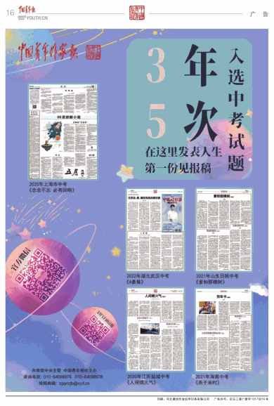 在接受本网站服务之前,请务必仔细阅读下列条款并同意本声明。 1. 凡本网注明"来源:中青在线或中国青年报"的所有作品,版权均属于中青在线或中国青年报社,未经本网授权,不得转载、摘编或以其它方式使用上述作品。 2. 本网授权使用作品的,应在授权范围内使用,并按双方协议注明作品来源。违反上述声明者,中青在线将追究其相关法律责任。 3. 凡本网注明“来源:XXX(非中青在线)”的作品,均转载自其它媒体,转载的目的在于传递更多信息,