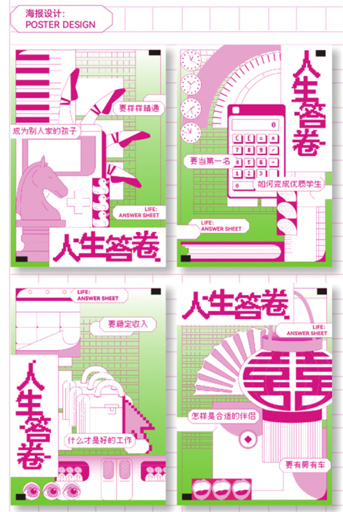 人生答卷海报设计以“社会时钟”为主题,通过解构的方式展现了人生经历和成长的不同阶段所经历的、追求的事物,以及元素视觉化。意在通过海报设计的方式唤起人们对自身真正需求的认知。