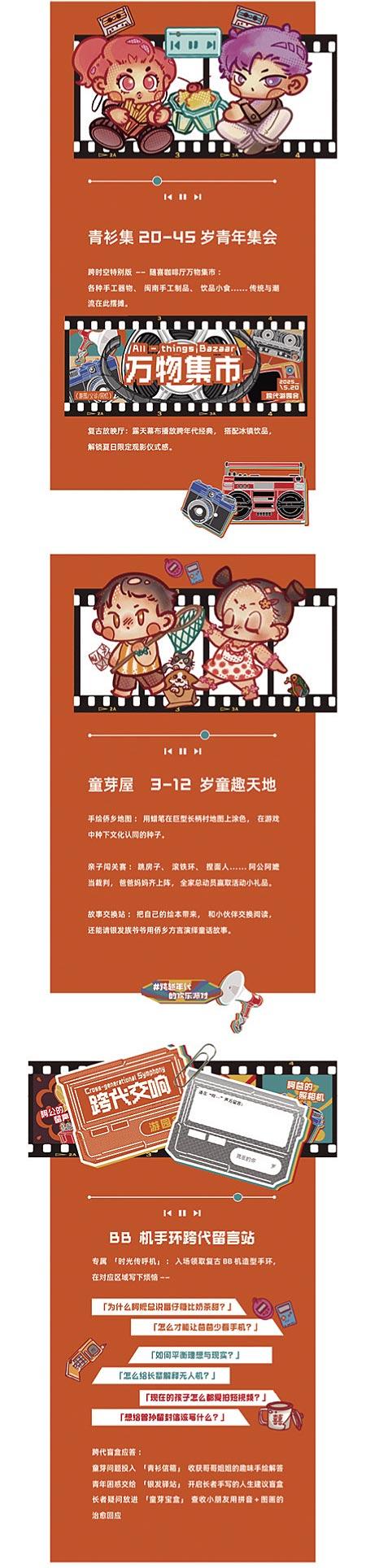 围绕“跨代交流”核心,设计巧妙嵌入互动逻辑。BP机手环跨代留言站,以复古BP机造型为载体,搭配“时光留言”引导,鼓励不同年龄层书写留言、交流互动;活动现场打卡区运用电视机、唱片机等经典元素,营造出极具氛围感的场景,为代际共同体验与话题互动提供空间。