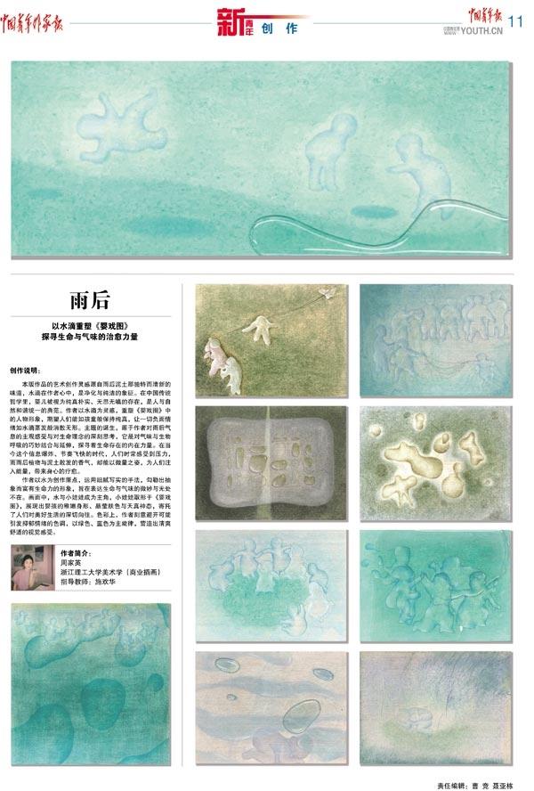 作者以水为创作原点,运用细腻写实的手法,勾勒出抽象而富有生命力的形象,旨在表达生命与气味的微妙与无处不在。画面中,水与小娃娃成为主角,小娃娃取形于《婴戏图》,展现出婴孩的稚嫩身形、晶莹肤色与天真神态,寄托了人们对美好生活的深切向往。色彩上,作者刻意避开可能引发抑郁情绪的色调,以绿色、蓝色为主旋律,营造出清爽舒适的视觉感受。
