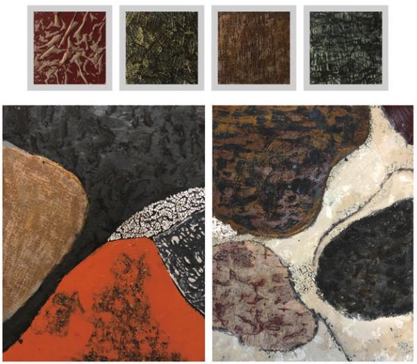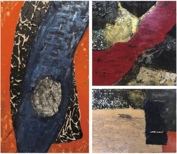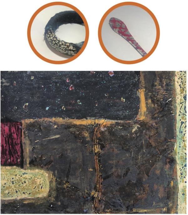 作品以传承千年的天然大漆为核心材料,取自漆树原生汁液,固化后防腐耐酸碱,兼具实用与工艺价值,明清髹漆工艺更将其推向巅峰。创作搭配豆包布、泡泡纱、丝绸等多种纤维,辅以金箔、鲍鱼贝、蛋壳等传统辅料,先在10cm×10cm木板上完成材料技法实验,最大化挖掘材质潜力。作者沿用打捻、材料起纹、研磨、蛋壳镶嵌等经典漆艺技法,经贴布、晾干、撕布打造凹凸纹理,反复髹涂色漆,每层静置风干5日以上,再用400目至1000目砂纸逐级水磨,最终打磨出温润渐变的层次肌理,完成系列综合材料绘画与首饰衍生品创作。